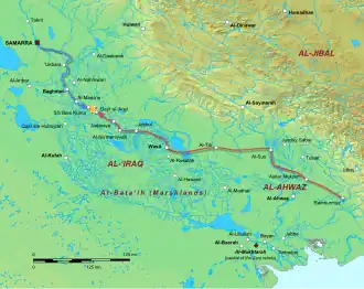 Якуб проехал через Хузестан, во время которого он добился перебежчика бывшего генерала халифа Абу-с-Саджа Дивдада, и вступил в Ирак. Согласно одному источнику, Якуб на самом деле не ожидал, что халиф предложит сражение; вместо этого он уступит любым требованиям Саффарида[15][18]. Однако Аль-Мутамид послал аль-Муваффака остановить его. Две армии встретились в Истарбанде, между Дайр аль-Акулом.