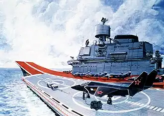 Так в представлении американского художника должен был выглядеть ТАКР «Тбилиси» (в будущем «Адмирал Кузнецов»). На палубе стоит Як-41 — это его первое изображение, появившееся вне СССР. Иллюстрация из журнала «Soviet Military Power»