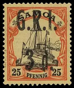 На Новой Гвинее, Маршалловых островах и Самоа «Яхта „Гогенцоллерн“» надпечатывалась аббревиатурой G.R.I. (лат. Georgius Rex Imperator, «Георг, король и император» — подпись Георга V), при этом часть тиражей надпечатывались для служебного использования (Official Service) — O.S. G.R.I. Камерунские надпечатки выглядели иначе — C.E.F. (англ. Cameroon Expeditionary Forces, «Экспедиционные силы в Камеруне»). В Того были выпущены в обращение «Яхты» без смены валюты с надпечатками по-английски TOGO Anglo-French Occupation для британской зоны оккупации и по-французски TOGO Occupation franco-anglaise для французской зоны[24][25]. Известны экземпляры с двойными, тройными, перевёрнутыми надпечатками, пропусками букв, ошибками в тексте и т. д[26].
