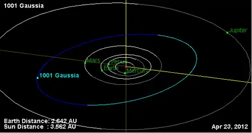 ![]() Орбита астероида (1001) Гауссия (синий), орбиты планет (красный) и Солнце в центре (чёрный). | |