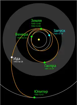 В 1993 году мимо Иды пролетел космический аппарат «Галилео», направлявшийся к Юпитеру. Главной целью миссии были Юпитер и его спутники, а сближение с астероидами Ида и Гаспра носило второстепенный характер. Они были выбраны в соответствии с новой политикой НАСА, которая предусматривает сближение с астероидами для всех миссий, пересекающих главный пояс[11]. До этого ни одна миссия не предполагала таких сближений[12]. «Галилео» был выведен на орбиту 18 октября 1989 года космическим челноком «Атлантис» (миссия STS-34)[13]. Изменение траектории «Галилео» для сближения с Идой дополнительно требовало расхода 34 кг топлива, поэтому решение об изменении траектории было принято только тогда, когда было точно выяснено, что оставшегося на аппарате топлива хватит для завершения главной миссии к Юпитеру[11].