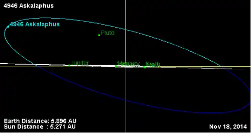 - Орбита астероида Аскалаф и его положение в Солнечной системе