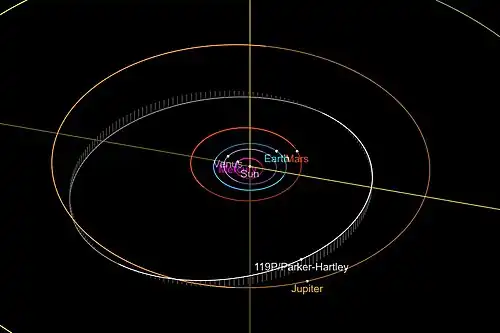 - Орбита кометы Паркера — Хартли и её положение в Солнечной системе