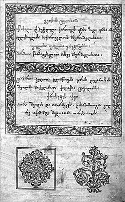 Титульный лист поэмы Шота Руставели «Витязь в тигровой шкуре», напечатанной в Тбилиси в 1712 году под покровительством Вахтанга VI Картли.