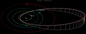 В афелии удаляется от Солнца на 506 млн км, в перигелии приближается к нему на 48 млн км (Меркурий в афелии находится в 69,8 млн км от Солнца).