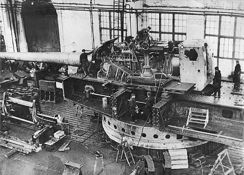 Изготовление и сборка артиллерийских башен традиционно происходили на специальных заводских стендах — «ямах». Там они монтировались, после чего разбирались, транспортировались к месту установки, где происходили окончательная сборка, установка на корабль, отладка и сдаточные испытания. Башенная броня окончательно устанавливалась уже непосредственно на корабле. Монтаж башен главного калибра должен был производиться с помощью плавучих кранов большой грузоподъёмности[15].