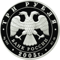 В центре диска — эмблема Банка России (двуглавый орёл с опущенными крыльями, под ним надпись полукругом «БАНК РОССИИ»), обрамлённая кругом из точек и надписями по кругу: вверху — «ТРИ РУБЛЯ», внизу — «2005 г.», слева — обозначение металла, проба сплава, справа — содержание драгоценного металла в чистоте и товарный знак монетного двора. | |
