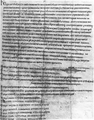 Король МерсииЭтельбальд издаёт «Диплом Исмере» (хартия короля Этельбальда элдормену Кунеберту). Этот документ начинается с описания Этельбальда как «короля не только Мерсии, но также и всех областей, которые называются общим именем Южная Англия»; далее в списке он назван «Rex Britanniae» («Король Британии»).