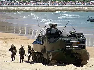 AAV7 в доковой камере десантного корабля-дока LSD-43 «Форт МакГенри» (Fort McHenry).![LVTP-7 на пляже Кауаи, Гавайи, на горизонте — УДК LHA-5 «Пелелиу»[англ.] (Peleliu) класса «Тарава».](./LVTP-7.jpg)