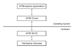 APM использует многоуровневый подход к управлению устройствами. Программы (а также драйверы) обращаются к операционной системе (драйверу APM). Далее ОС обращается к APM-совместимому BIOS, который управляет оборудованием.