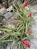 Стебель укорочен. Листья в плотных розетках, до 30 см дл. и до 6 см шириной у основания, очень жёсткие, отогнутые, серо-зелёные, на свету и особенно во время цветения окрашиваются в красный цвет, по краю с крепкими, загнутыми жёлтыми шипами до 2 мм дл. Светонос до 30 см дл., или сильно укорочен и тогда, соцветие погружено в розетку листьев. Соцветие головчатое, плотное, многоцветковое или рыхлое, малоцветковое. Брактеи и брактеолы красные, цветки — лиловые. Плод сухая ягода чёрного цвета. Семена мелкие, до 2 мм дл.
