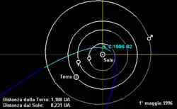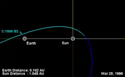 Первые расчёты орбиты кометы, выполненные руководителем Центрального бюро астрономических телеграмм Брайаном Марсденом 3 февраля[13], показали, что 25 марта 1996 года комета пройдёт примерно в 0,1 а. е.[прим 2] от Земли[14]. Для комет это очень малое расстояние: в прошлом веке только четыре «хвостатые странницы» проходили ближе: С/1983 H1 (IRAS — Араки — Алкока), 7P/Понса — Виннеке, 73P/Швассмана — Вахмана и C/1983 J1 (Сугано — Сайгусы — Фудзикавы).[15][16]