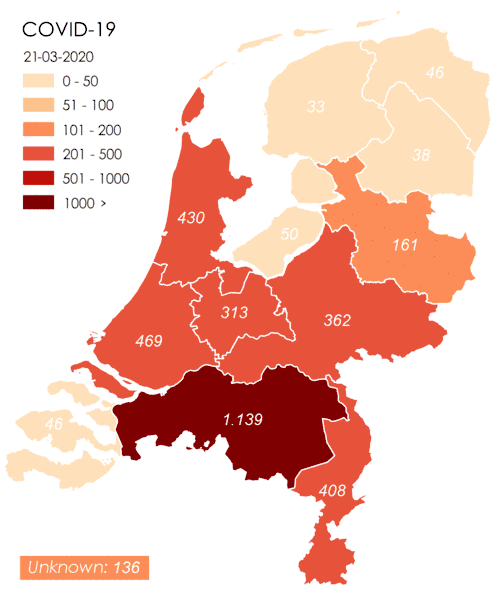 К 20 марта число пациентов с коронавирусной инфекцией увеличилось в Северном Брабанте настолько, что ряд больниц там достиг предела своих возможностей. Чтобы сосредоточиться на оказании неотложной помощи пациентам с COVID-19, больницы региона отменили все плановые операции. Тем не менее, им пришлось обратиться за помощью к медикам из других провинций[24].