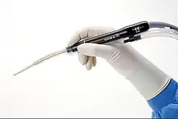 (1) Притягивает ткань к вибрирующему наконечнику и создаёт эффект взаимодействия между наконечником и тканью. (2) Удаляет ирригационную жидкость и фрагментированную ткань с операционного поля.