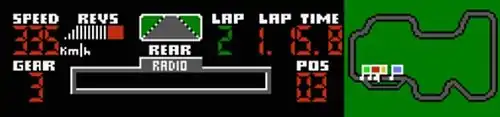 В самой левой части отображается текущая скорость (Speed) и выбранная передача (Gear). Чуть правее спидометра отображаются тахометр (Revs) и зеркало заднего вида (Rear). Под ним — информационная панель (Radio). По ней вас будут предупреждать о надвигающихся опасностях, ограничениях позиций и др. В центральной части отображается индикатор пройденных кругов (Lap) и пройденного времени для текущего круга (Lap Time). Под ними отображается ваша позиция в гонке (Pos). В правой части отображается карта трассы с флажком вашей машины и первых трёх соперников.