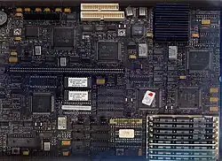 Материнская плата модели с микропроцессором Intel i486SX, с удлинённым разъёмом (чёрный, горизонтально посередине/слева между верхним и нижним краем) для райзер-карты, на которой расположены слоты шины ISA