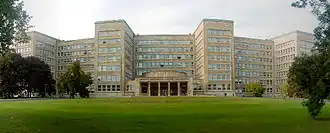 В период с 1942 по 1945 год пестицид на основе цианида Циклон Б использовался для убийства более миллиона человек, в основном евреев, в газовых камерах в Европе, в том числе в лагерях уничтожения Освенцим II и Майданек в оккупированной Германией Польше.[29] Ядовитый газ поставлялся дочерней компанией IG Farben, Degesch (Немецкая компания по борьбе с вредителями).[17] Degesch первоначально поставлял газ в Освенцим для окуривания одежды, зараженной вшами, которые переносили тиф. Фумигация проходила в закрытом помещении, но это был медленный процесс, поэтому Дегеш рекомендовал построить небольшие газовые камеры, которые нагревали газ до температуры более 30 °C и убивали вшей в течение одного часа. Идея заключалась в том, что заключенные будут бриться и принимать душ, пока их одежда будет окуриваться.[30] Впервые газ был применен к людям в Освенциме (650 советских военнопленных и 200 других) в сентябре 1941 года.[31]