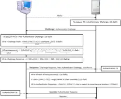 - 4c. Сервер конкатенирует 20-байтовый выход SHA-1 со стадии (4b), начальные 8 байт «Challenge Hash» (сервер генерирует его также, как и клиент) и символьную строку «Pad to make it do more than one iteration», а затем хеширует результат с помощью SHA-1.
