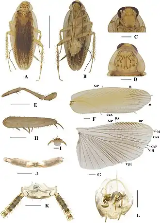 Тело небольшое (около 1 см), желтовато-коричневое. От близких видов может быть отличим по следующим признакам: акцессорный склерит медианного фалломера без поперечного стержня и без щёточной структуры на вершине; левый фалломер с палочковидной структурой; передневентральный край переднего бедра Тип B2. Межоцеллярное расстояние немного шире расстояния между глазами, уже расстояния между усиковыми впадинами. Пятый нижнечелюстной пальмомер расширен, третий и четвёртый пальмомер оба длиннее пятого. Переднеспинка субэллиптическая, шире длины, диск обычно с симметричными макулами и полосами. Надкрылья и задние крылья полностью развиты. Вид был впервые описан в 2021 году. Валидный статус вида был подтверждён в 2024 году китайскими энтомологами из Southwest University (Чунцин, Китай)[1][3].