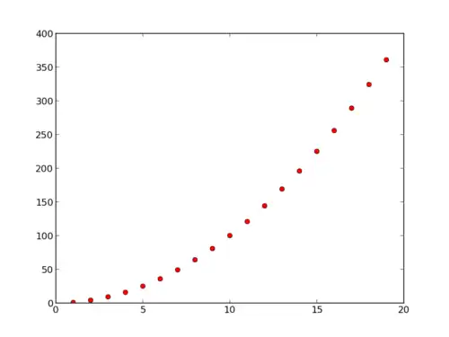 [i * i for i in range(1, 20)], 'ro')