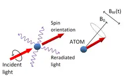 Падающий свет круговой поляризации возбуждает атом из основного состояние в возбужденное. Полученная атомом энергия расходуется в виде переизлученного спонтанного света и на создание макроскопического спина, который прецессирует вокруг магнитного поля