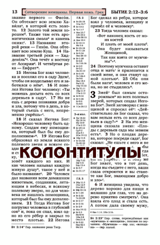 Колонтитулы. Для того, чтобы облегчить поиск необходимых мест Библии в «Переводе нового мира», почти на каждой странице верху расположены колонтитулы, в которых кратко упоминается о содержании страницы[18].