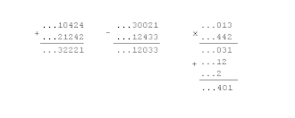 В такой форме записи натуральным числам и нулю соответствуют p-адические числа с конечным числом ненулевых цифр, совпадающих с цифрами исходного числа. Отрицательным числам соответствуют p-адические числа с бесконечным числом ненулевых цифр, например в пятеричной системе −1=…4444=(4).