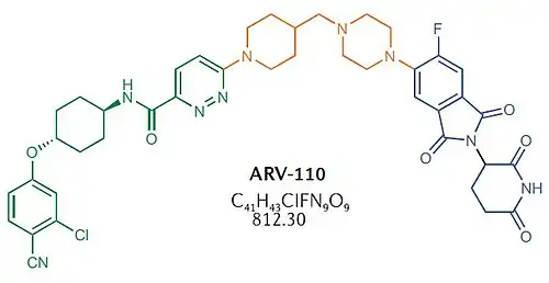 Для каждого целевого белка должен быть создан свой уникальный лиганд, подобран линкер оптимальной длины и выбран один из известных лигандов убиквитинлигазы Е3. На рисунке 2 приведен конкретный пример, когда неспецифичный ингибитор 144-х протеинкиназ, соединенный линкером с лигандом убиквитин лигазы Е3 (Сereblon) удаляет из протеома клетки сразу 144 различных протеинкиназы[2]. На рисунке 3 приведен пример PROTAC-молекулы, которая соединяет рецептор андрогенных гормонов (AR) с лигазой Е3 (Cereblon), что приводит к деградации рецептора (AR) и остановке роста опухоли. Эта молекула проходит клинические испытания, как лекарство при метастатическом раке простаты[3].