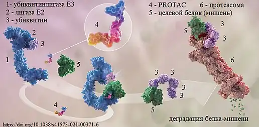 Комбинированная молекула выборочного протеолиза белка (англ. A proteolysis targeting chimera, PROTAC) — комбинированная молекула (гетеробифункциональная, химера) имеющая два фрагмента, соединённых линкером, и активирующая выборочный протеолиз целевого белка[1]. Первый фрагмент такой молекулы является лигандом целевого белка, а второй фрагмент лигандом фермента убиквитинлигаза Е3. Такая комбинированная молекула сближает, притягивает целевой белок к убиквитинлигазе Е3. Использование убиквитинлигаз Е3 (в том числе VBP1, MDM2, βTrCP1, Cereblon, cIAP1) позволяет подвергнуть целевой белок убиквитилированию и протеасомной деградации (схематический рисунок 1).