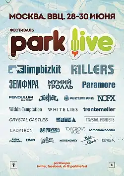 Летний фестиваль Park Live — новый формат уже известных слагаемых: музыка, творчество, развлечения, солнечный свет, свежий воздух, умная публика и позитивная атмосфера. Объединяющим фактором стала выбранная площадка для фестиваля: Всероссийский Выставочный Центр, место, изначально сочетающее в себе историю и пространство, культуру поколений и масштабное её воплощение. В 2015 году фестиваль проходил на стадионе «Лукойл Арена». Park Live — фестиваль, существующий вне рамок и стилевых ограничений. Park Live предназначен для зрителей самых разных возрастов и музыкальных пристрастий. В 2014 году фестиваль должен был пройти в Киеве, но был отменен из-за политической обстановки в стране. В разное время фестиваля, хедлайнерами становились System Of A Down, Limp Bizkit, The Killers, Pendulum, Земфира, Мэрлин Мэнсон, The Prodigy, Deftones, Muse, Red Hot Chili Peppers и Лана Дель Рей. В 2014 году произошёл крупный скандал с отменой концерта Мэрлина Мэнсона. В конце ноября 2017 года было объявлено, что в 2018 году фестиваль пройдет на территории ЦПКиО имени Горького. В 2018 году, во второй день фестиваля, выступление группы Gorillaz было прервано из-за грозы и сильного дождя. В 2019 году, на фестивале должна была выступить группа The Prodigy, но в связи со смертью солиста Кита Флинта, группа объявила об отмене всех своих концертов, в том числе и в России. Вскоре, было объявлено, что их заменит хип-хоп группа из ЮАР Die Antwoord[1]. В 2020 и 2021 году фестивали были отменены в связи с пандемией COVID-19. В 2022 году фестиваль также не состоялся. В 2024 году фестиваль впервые прошел в Казахстане, в городе Алматы[2].