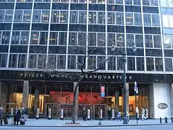 Pfizer, Inc. (произносится «Файзер» /ˈfaɪzər/[5][6], официально «Пфайзер»[7][8][9][10]) — американская транснациональная компания, одна из крупнейших фармацевтических компаний мира. Компания производила самый популярный в мире препарат липитор (липримар, аторвастатин); этот препарат используется для снижения уровня холестерина в крови, за период с 1997 по 2012 год его было продано на 125 млрд долларов[11][12]. Также компания продаёт следующие популярные лекарственные средства: лирика, дифлюкан, зитромакс, виагра, целебрекс, сермион, достинекс, чампикс. Акции компании Pfizer в 2004 году включены в базу расчёта Промышленного индекса Доу Джонса, а в 2020 году исключены из неё[13]. Штаб-квартира расположена в Нью-Йорке, а главный исследовательский центр находится в Гротоне, штат Коннектикут.