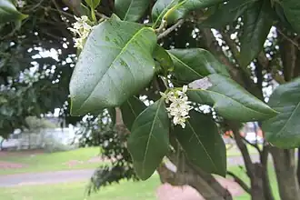 Вечнозелёный кустарник или небольшое дерево высотой 10-15 м с несколько открытой кроной. Кора грубо текстурированная белого или серого цвета. Кожистые листья супротивные имеют эллиптическую или обратнояйцевидную форму, каждый длиной 6-8 см. Листья сверху темно-зелёные, снизу более бледные, гладкие, с цельными краями. Кистевидное соцветие несёт гермафродитные белые цветки, иногда душистые, с четырьмя лепестками. Плод — мясистая костянка около 2 см с одним семенем, похожая на оливку. Плод изначально зелёный, по мере созревания становится пурпурно-чёрным[3][4].