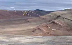 Географическое и стратиграфическое положение места обнаружения остатков кикиктании (NUFV 137); остатки тиктаалика были обнаружены на участке NV0401, расположенном на 80 м ниже NUFV 137 |