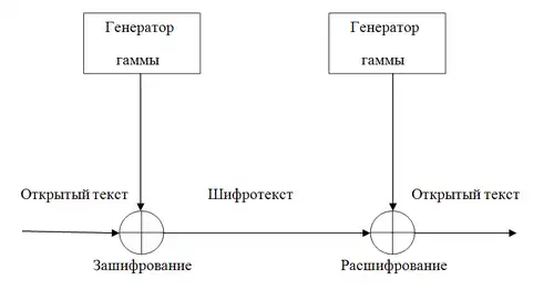 2. Поток битов ключа складывается с шифрограммой () операцией «xor». В силу свойств операции «xor» на выходе получается исходный (незашифрованный) текст ():