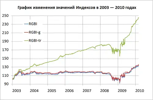 - Индекс государственных облигаций России — совокупный доход (MCX: RGBITR), который рассчитывается по методике индекса совокупного дохода (англ.) (total return index (англ.)).
