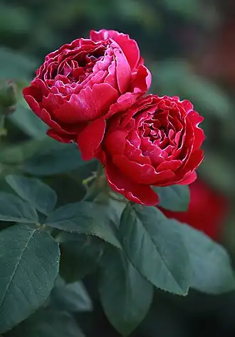 | 'Gloire des Rosomanes' Plantier, 1825 триплоид, гибрид розы китайской, бурбонская роза, цветки красные | ||||||||||||||||