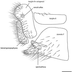 Брюшко жёлто-зелёное сверху, белое снизу; тёмная полоса на 2-4 тергитах; слабо выраженное тёмное пятно находится латерально на 3-5 тергитах; 8-й стернит находится медиально с пучком коротких сильных щетинок. Седьмой стернит с широко заостренным задне-медиальным краем с пучком коротких тёмных щетинок; субгенитальные части относительно широкие; сперматека с отростками-парусами (vela) относительно короткая и прямая; вентральное вдавление относительно неглубокое и широкое[1].