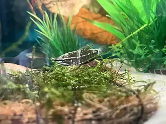 Достигает длины 5—6 см. Вытянутое по форме тело, слегка приплюснуто с боков. Линия спины изогнута. Окраска тела самца шоколадно-коричневая, иногда на отблеск зеленоватая. На теле 5—6 светлых поперечных полос. Спинной и анальный плавники светло-коричневые с золотистой каймой. Хвостовой плавник прозрачный. Брюшные плавники вытянуты. В период нереста хвостовой плавник самца становится черно-коричневым, а грудь у самки красноватой. Самки намного ярче.