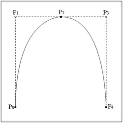 На рисунке 4 та же самая кривая, но точка P2 отсутствует. Её координаты восстанавливают. Например в данном случае точка P2 лежит посередине отрезка P1P3. Подробнее об этом можно почитать в описании построения кривой Безье, квадратичный метод.