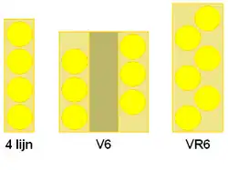 Рядно-смещённая компоновка, которая обозначается буквами «VR», зародилась в 1920-е годы, когда компания Lancia наладила выпуск семейства V-образных моторов с очень маленьким углом развала цилиндров (всего 10-20°). На модели Lancia Fulvia V4 подобные моторы использовали до начала семидесятых годов. Отказ от такой компоновки был вызван прежде всего технологическими проблемами: сложностью отливки блока цилиндров, неравномерностью чередования вспышек и неудобной конструкцией распределителя зажигания, разным временем накопления для разных цилиндров.[1]