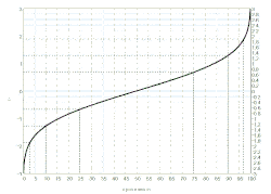 Поскольку распределение z-оценок аппроксимируется стандартным нормальным распределением, то существует однозначное соответствие процентилей (квантилей порядка q) и значений z. Это позволяет однозначно переводить шкалу ранговых градаций или баллов в значения z-оценки и обратно (так значению z=-3 соответствует 0,13 процентиль, z=- 2 2,3-й процентиль, z=-1 15,9-й процентиль и т.д.).